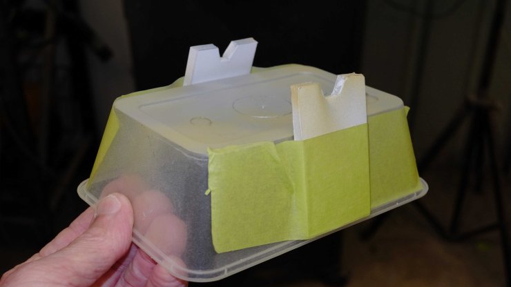 d. You can cut a plastic food container open so that it supports a model on either the wings or the fuselage ( two different patterns ) and then smooth the edges of the plastic with cheap masking tape. Pop the model upside down on the support and spray the underside – pit the freshly painted thing into a sealed plastic box until the paint sets – then turn the plane over and do the other side.