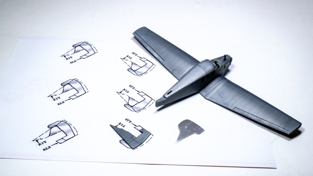 Fortunately this sort of model was also made by a Canadian modeller from the same kit and he put his formula for the new tail onto the internet from – of all places – Prince George B.C. I copied out his drawing, compared it with the plastic Revell example, and made a full-scale plan. That’s a scrap proof-of-concept piece in the picture.