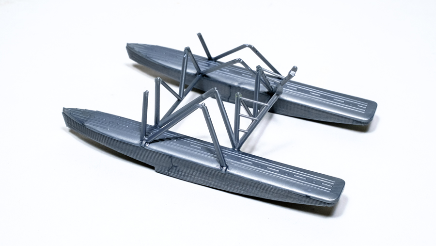 The floats are complex- no doubt about that. Revell have done their best with e struts but you are still setting 6 frames in place between two floats and the wing. I elected to assemble them in a jig separate from the wing and then let the soft cement set while the struts rested in their sockets. It was not perfect, but as close as dammit anyway.