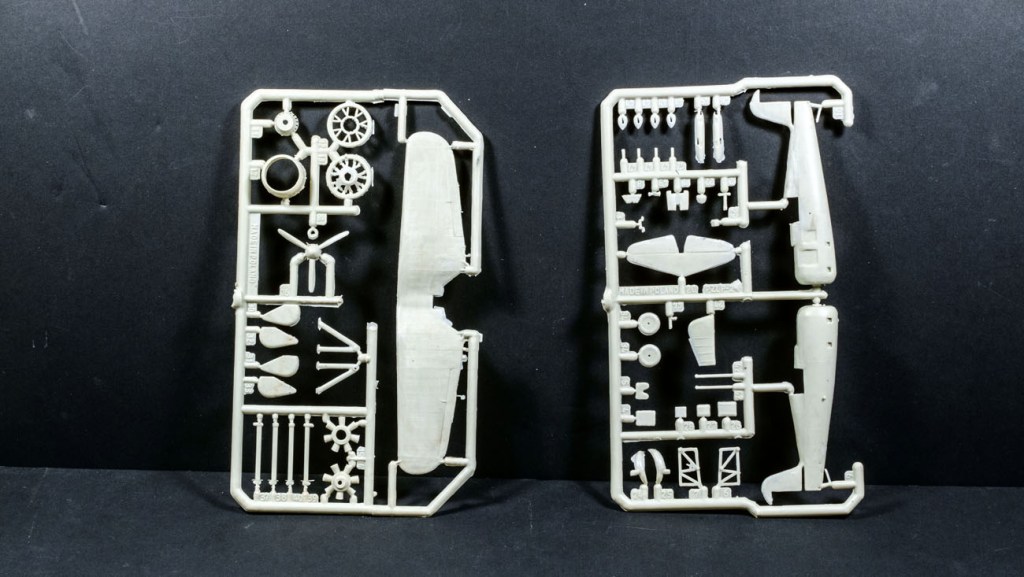 The plastic also has a peculiar ” dirty ” look about it that reminds me of Mach 2. I don’t mean to to be mean when I say that – but there are swirls of darker colour in the grey. Perhaps they were moulding something in a darker styrene before they poured into this mould. The surface texture is markèd, though some of that is deliberate – the upper surface of the wing is designed to look very fabric-like. I wonder what will happen with the decals.