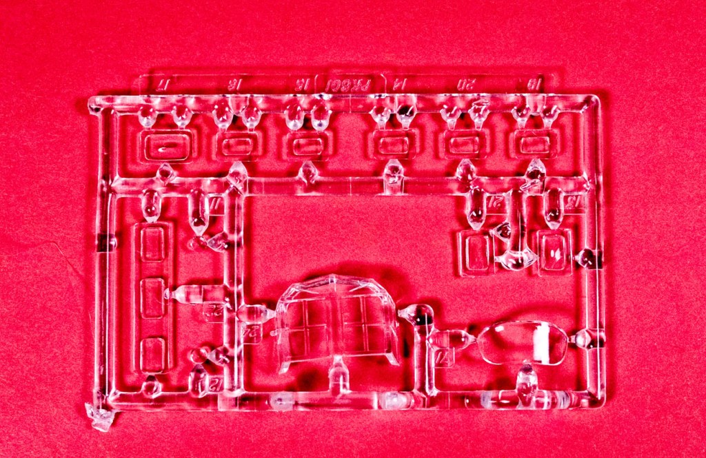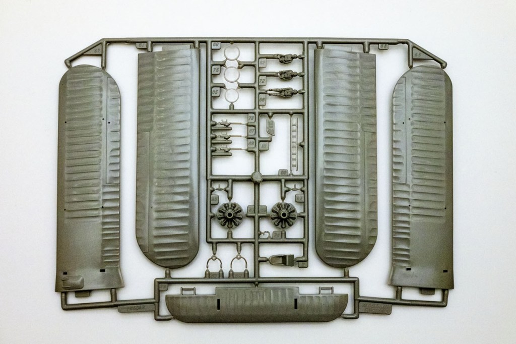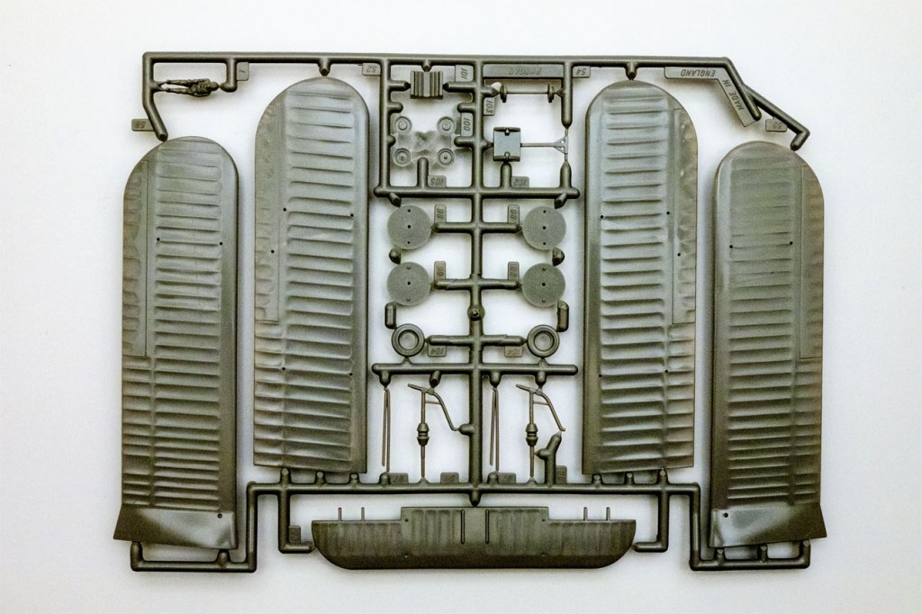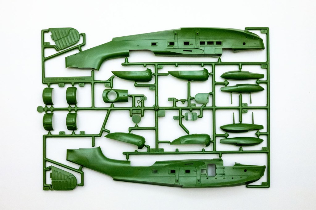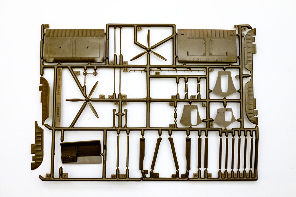 The kit was a three-colour one – green, brown, and grey. Clean moulding – as it would be, being new back then. Sad decals, but at least they gave the dimensions for new purchases or printing. Wonderful clear parts.