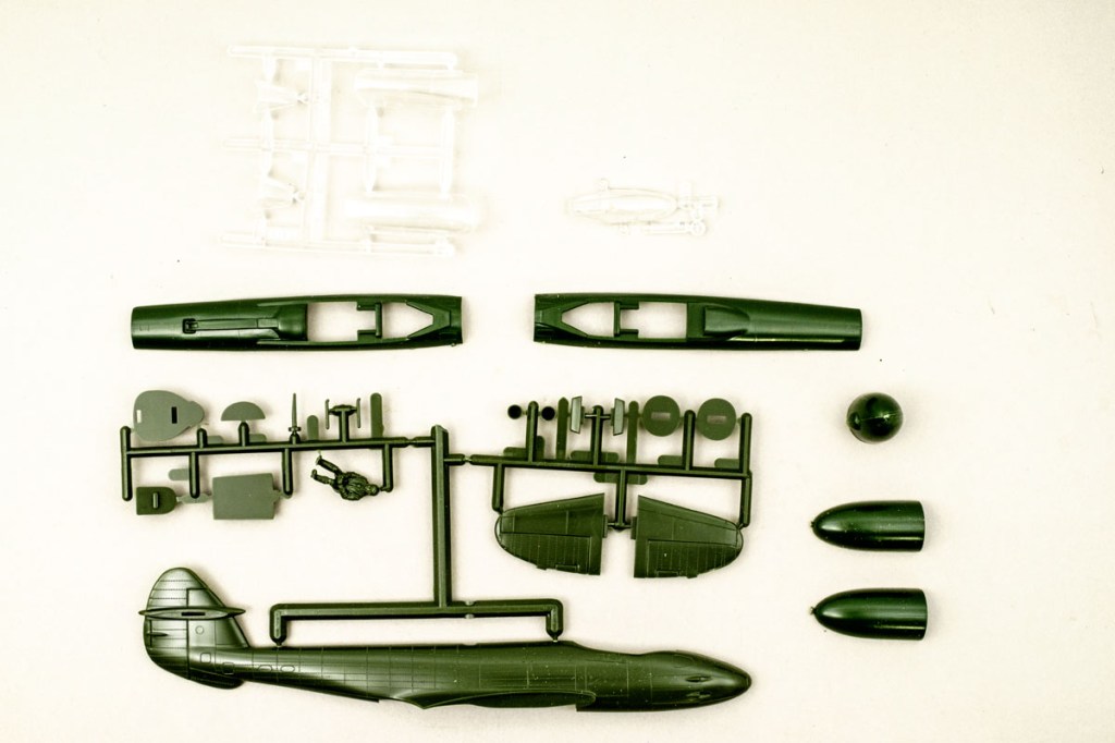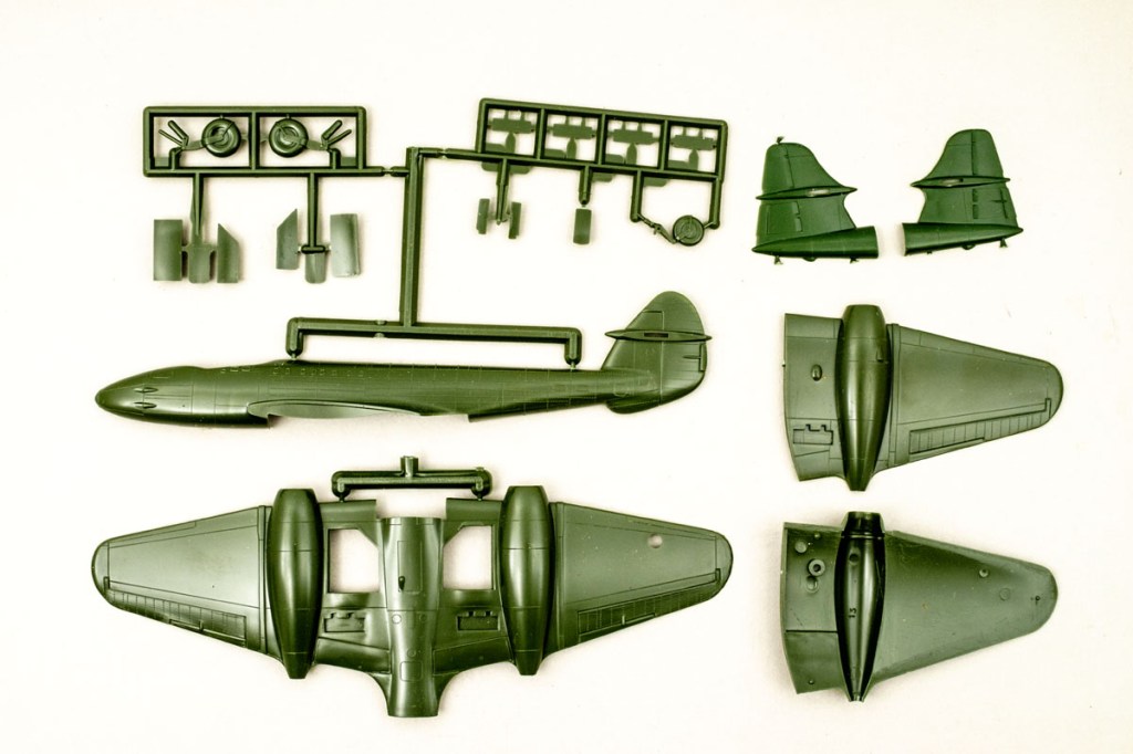 He had apparently intended it to become an RAAF plane, and most probably a two-seater night fighter variant. Possibly the NF.8. There were parts in the kit in a similar green plastic to the main moulding that duplicated a section of the top of the fuselage and the tail. The main kit is late 50’s Airfix in a box but the spare parts are a mystery. Perhaps Matchbox?