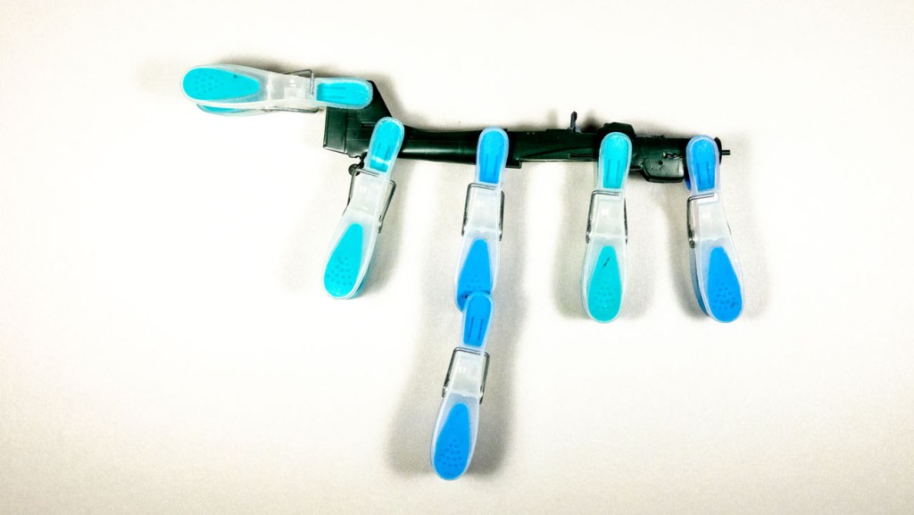 The clamps that we favour – wooden or plastic clothesline pegs. are generally set to a strong pressure. The spring is rarely adjustable. So I bracket one peg with another – the grip of the hindmost feathering the grip of the front peg. Just enough to get the seam together but not enough to force it sideways.