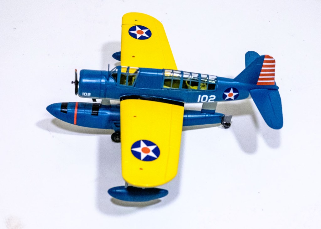 This version is the more common float plane that was mounted on warships as scout and artillery spotter. In the livery you see, it was a trainer at the naval air stations on the east coast of the US early in the war. The yellow wing was combined with the intermediate blue and grey scheme but no wing chevrons are evident in photos. Nor are there any squadron codes carried.