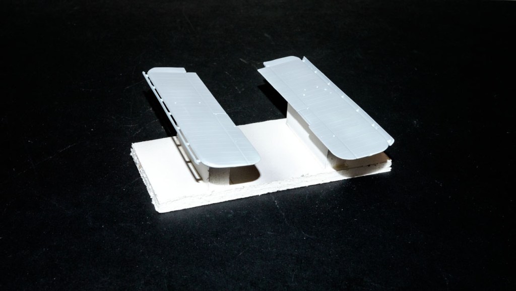 The wings are on paint racks – they are supported with such delicate struts and phenocky attachment points that I do not fancy trying the spray the whole as one assembly. I’ll bet the wings came off the real ones for shipping anyway. Or just fell off on hot days…