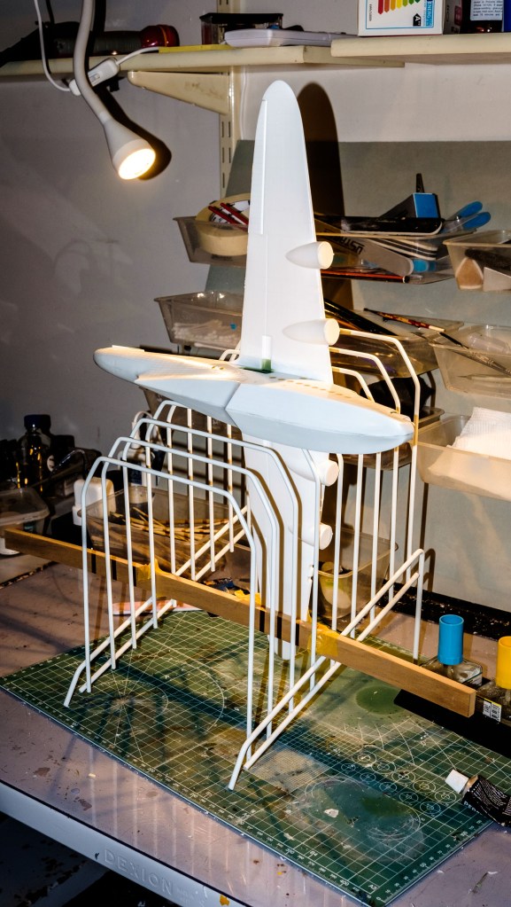 So it was a case of casting about for help from the household. The wire rack may have come from an old office and was intended to hold cardboard folders for filing. Or it might have been an LP rack. I’ve used it as a drying rack for photos and inkjet prints. Now it is an assembly rack for a Sunderland.