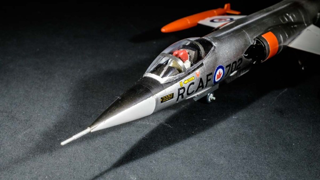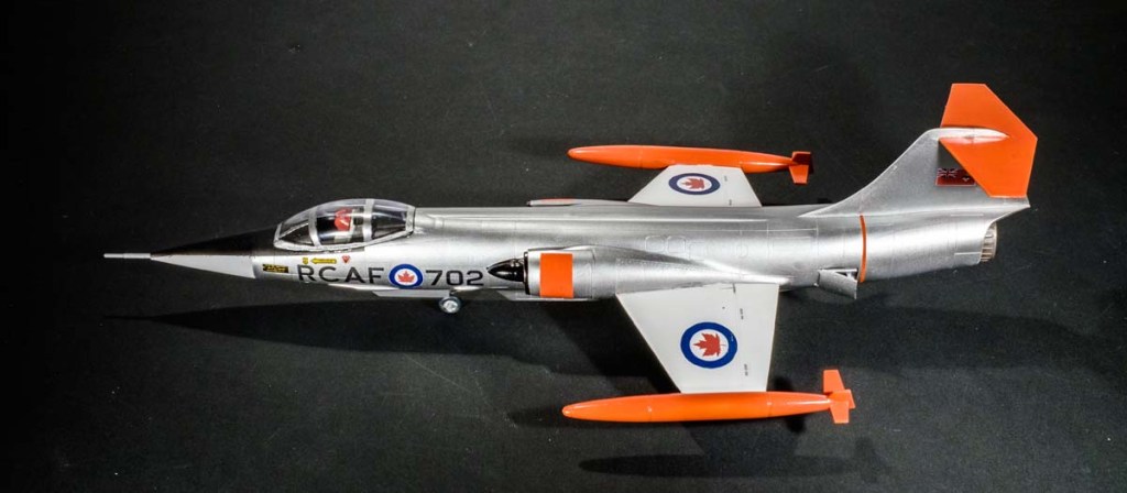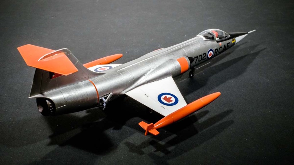 The scheme at the time featured plain polished fuselage, nuclear-flash white wings, and arctic red/orange tail and tip tanks. The exact shade of red varied over time as different paints were developed but the basic pattern was kept. In Canada the planes frequently flew with the tip tanks full of maple syrup – you could identify them by the big red maple leaf on a white circle inside a blue circle. An efficient fuel, but ground crews had to be careful that it didn’t cause undue tooth decay. Full-alert military afterburner take-offs smelt like a fire in a toffee factory.