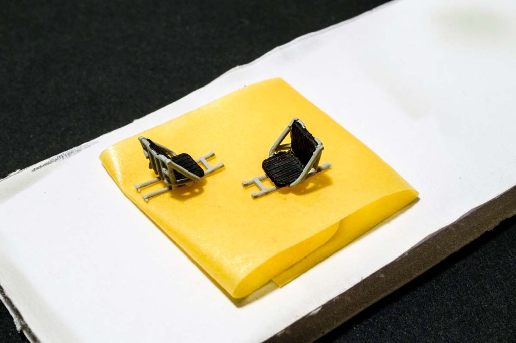 And the final sub-assembly – the seats. 5 parts per seat and that doesn’t include seat belts. They do indeed fit in the cockpit and attach to the floor and the cross-struts. At least someone in the ICM factory remains sober.