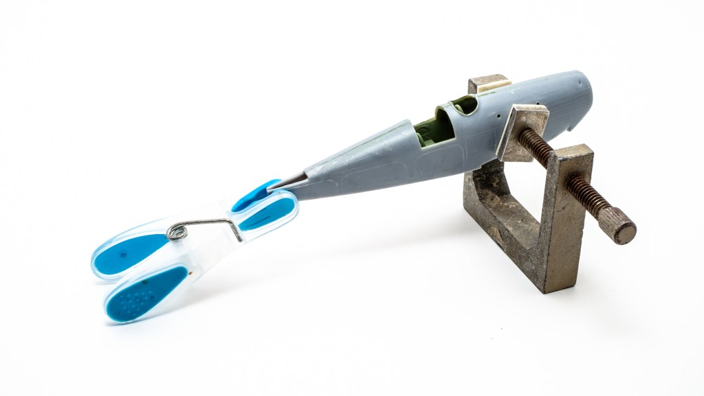 Apart from this, the general condition of the Wallace is actually pretty good for a period piece. The fuselage halves meet and mate well as soon as you trim off the locating pins. The picture of the fuselage setting is a reminder of how much we model in time as well as in space. The clamp holding the parts at the front is 50 years old. It’s an old Exacto tool that came in a set of four – I’ve only got three left and they are starting to distort a little, but in the day they were perfect for 90º gluing of wooden ship parts – holding an angle perfectly. They are no longer seen in the shops, but I’d buy them in a minute if they re-appeared.
