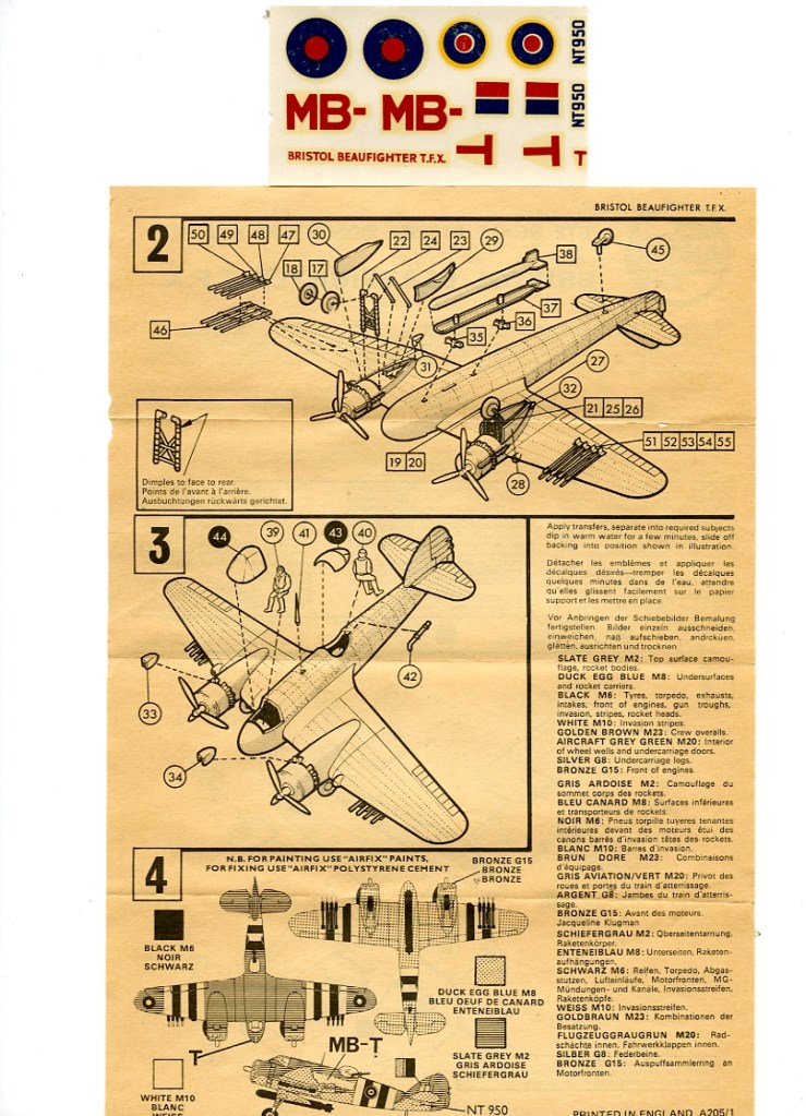 I built an Airfix Beaufighter model a year or so ago – the modern kit – and was extremely pleased with the result. It was completed as an RCAF model with a famous pilot in it. This Beau is a very much older version of the plane from Airfix. Scalemates tells me it is a 1976 rebox of a late 50’s kit. I believe, it, but am not put off in the slightest by the age of the mould.