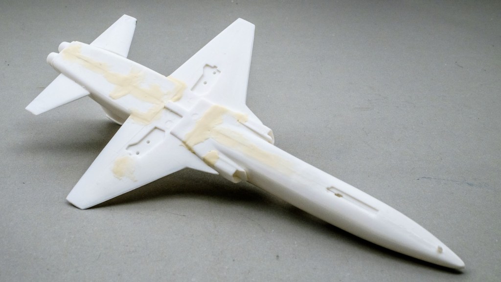 The putty is thick, and had to be applied in layers. The end result in white base coat is no beauty, but it should at least hold a coat of paint. I was grateful…or is that great fill?