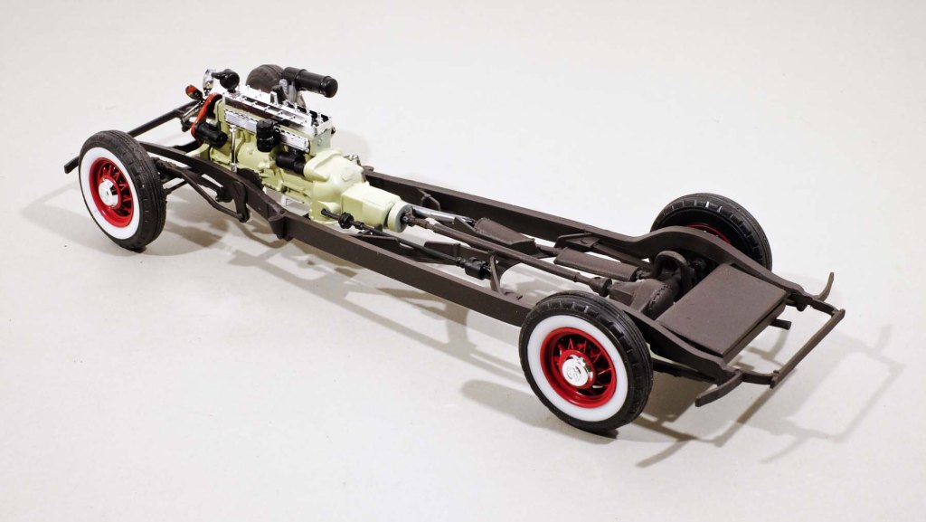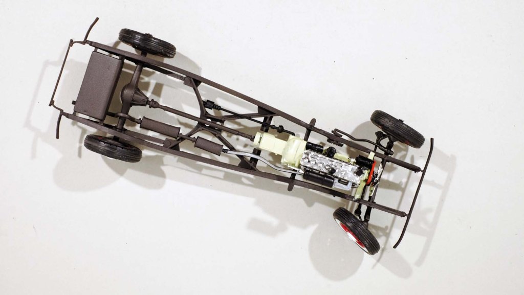 The frame is straight and all the components of the drive train fit and connect amicably. But the front axle’s connection to the steering wheel and the knuckles is anything but square. The tyres point in two separate directions and at varying angles. Photography of the finished model will need to be undertaken carefully.