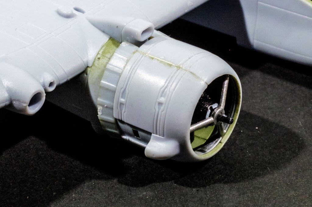 There are Port/Starboard keys at the rear of the engine crankcases that correspond to apertures in the bulkheads of the nacelles – sufficiently different to need attention. Fortunately when you do comply with Airfix orders they drop into place and match the air intakes perfectly. The odd cowling support struts are also handed and need to be assembled P/S to appear correct.