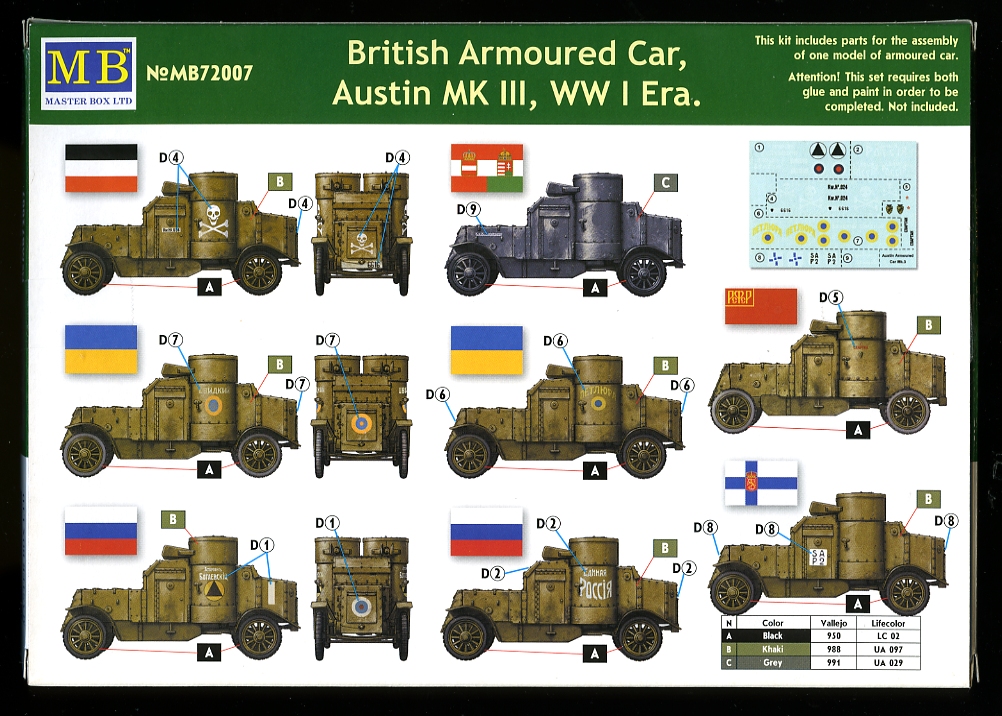 The company – Master Box Ltd. is a new one to me. Seems to originate from Dnepropetrovsk in the Ukraine. The product is first-rate in every respect; boxing, art, decals, sprue trees, design, instructions. It looks like they intend it for Britain, France, Ukraine, Russia, and Germany.