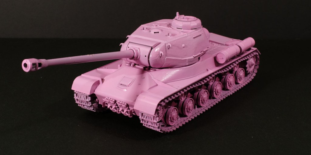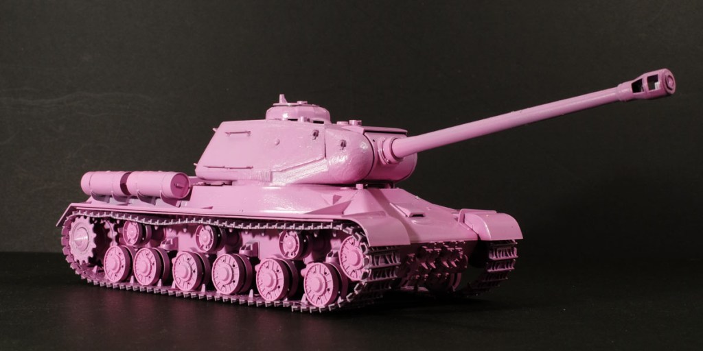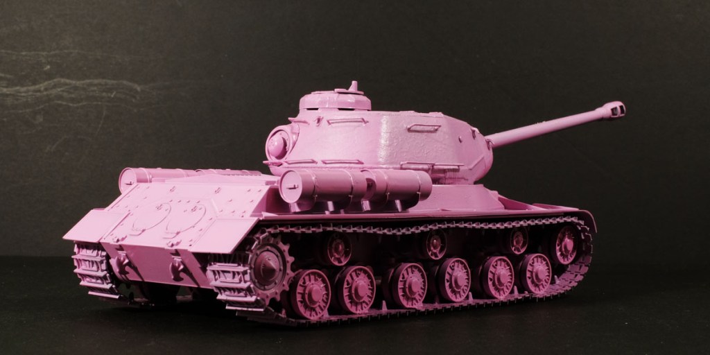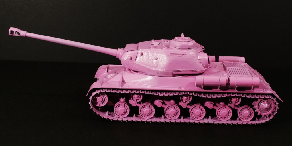 The JS-2 was a different matter – and in this I started with the internet inspiration to begin with. In 1991 A student, David Czernÿ, and his mates painted a Soviet-era monument tank pink. It caused outrage and arrests but some people took the protest with characteristic Czech humour. The vehicle spent the next few years alternating between green paint and pink as the various factions and movements got to it. It is unlikely to rust for want of a coating…