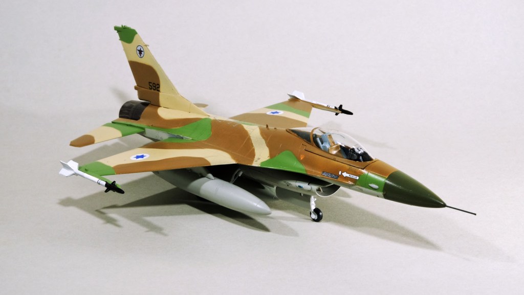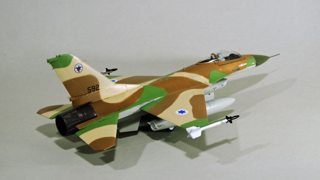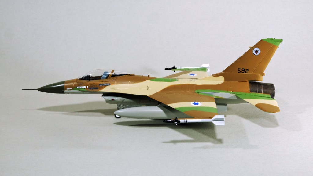 The IDF desert scheme in four-colour is well-known. I wish it was only two colours up top, but the people who fly them low and into trouble don’t agree with me, and they have the final say…so I just have to follow along. The fussy will find fault – the forgiving will recognize the effort put in. I am happy to say that the Mr. Color paints seem to match images on the internet, so I’ll continue to use them. No gloss before decals, but the magen are so small and the decal film so thin, that the seem to bed in with no problems.
