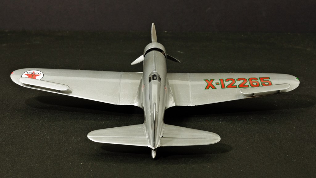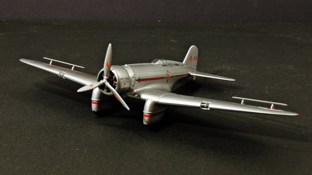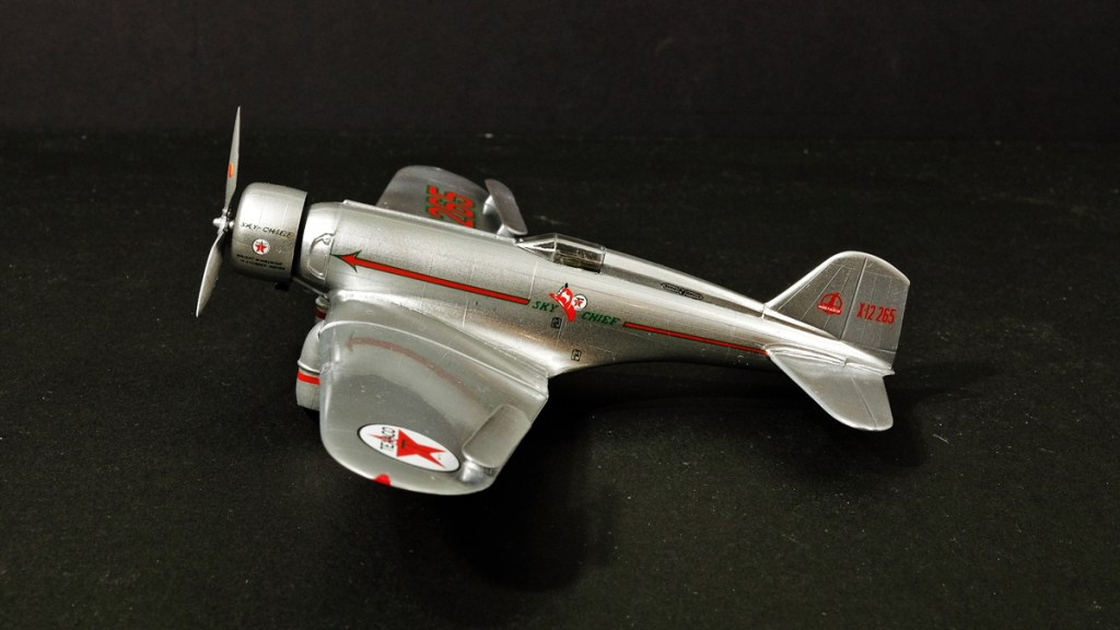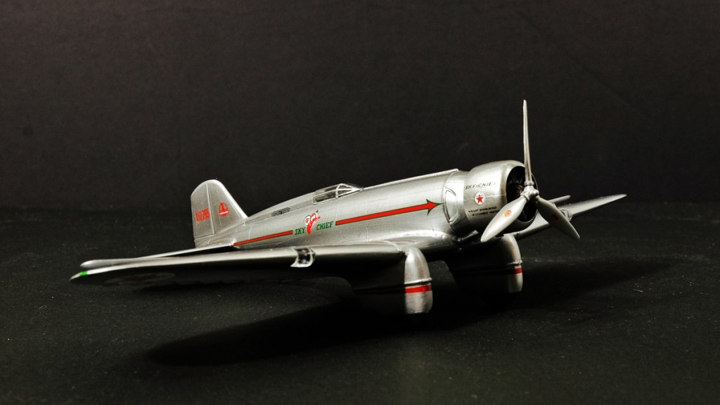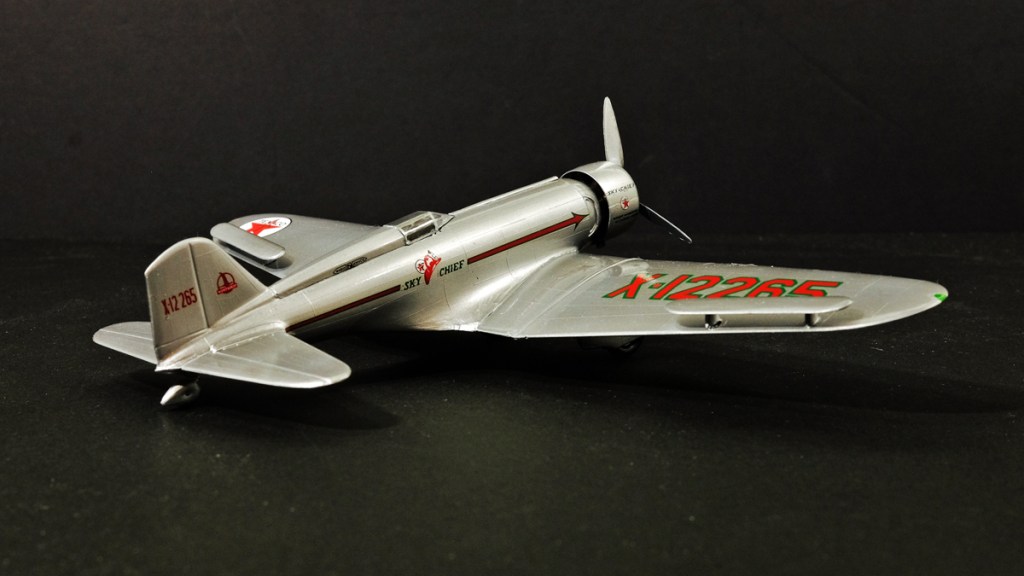 I was thrilled with the appearance of the model as it was a’building and the final bright silver finish is all I wanted. I chose the Texaco Sky Chief markings as much for the colour as for the history, but then puzzled as to one question: why was the Northrop Gamma made? The closest I could come was as a mail plane for TWA. Then a record breaker and exploratory aircraft. The bomber version that was developed from it was used ( ineffectively ) in China against the Japanese. It was a plane before its time for awhile and then behind it after that.