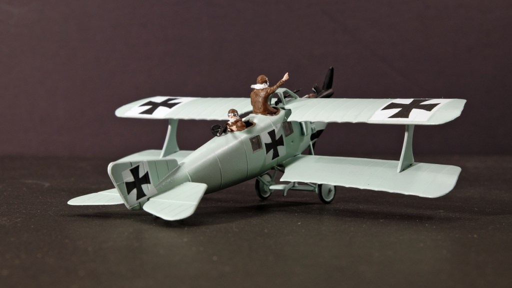 There is a good exposed engine, unusual fuselage windows, and two German fliers in enthusiastic positions. The gunner is attending to his duties, but the pilot is just skylarking about on the back of the seat before take-off. I think he has seen some girls at the edge of the flying field and is trying his luck.