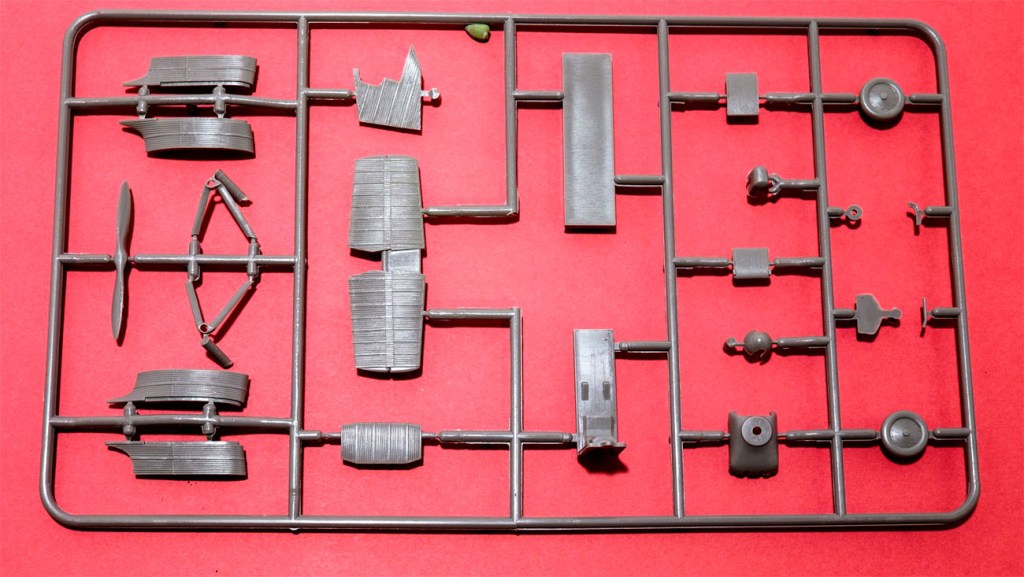 The two sprue trees are well spread out in the box. The windscreen demands minute inspection to find it – the decal sheet is just two red logos on the paper. Five colours are seen on it, and not a lot of paint needed either.