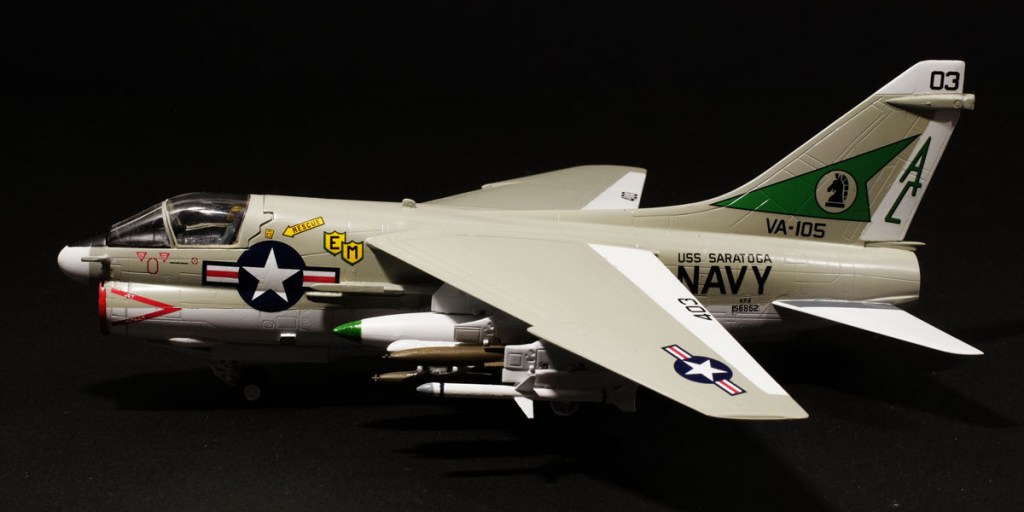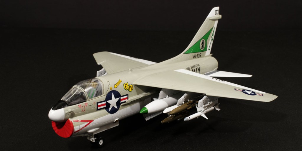 The Corsair turns out to be bomb delivery truck for a number of aircraft carriers from the 60’s onward. the amount of iron they hung under them was amazing. I’ve followed the Italeri call-out for the USS SARATOGA plane from the late 70’s and put on two big fuel tanks, 8 bombs and two Sparrow missiles. There are two empty fuselage racks that in another configuration might carry Sidewinders or umbrellas or whatever.