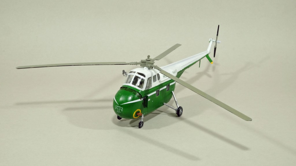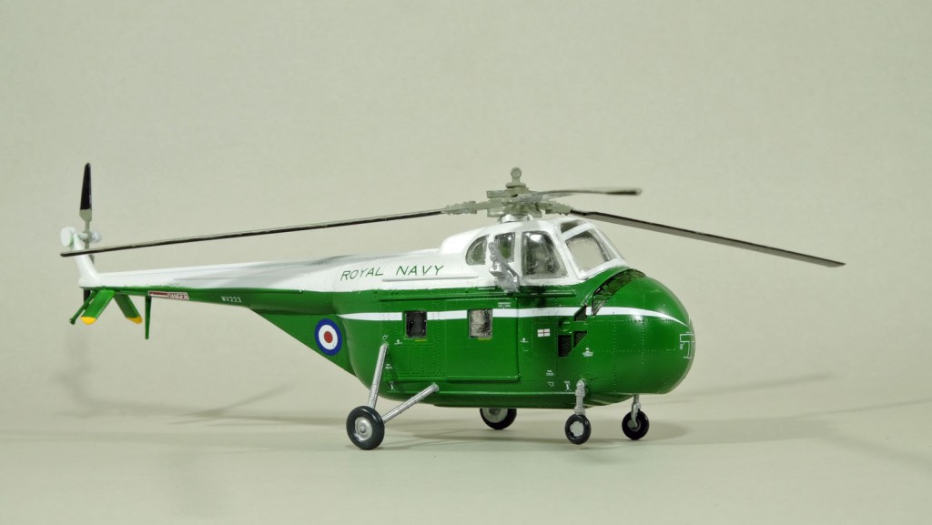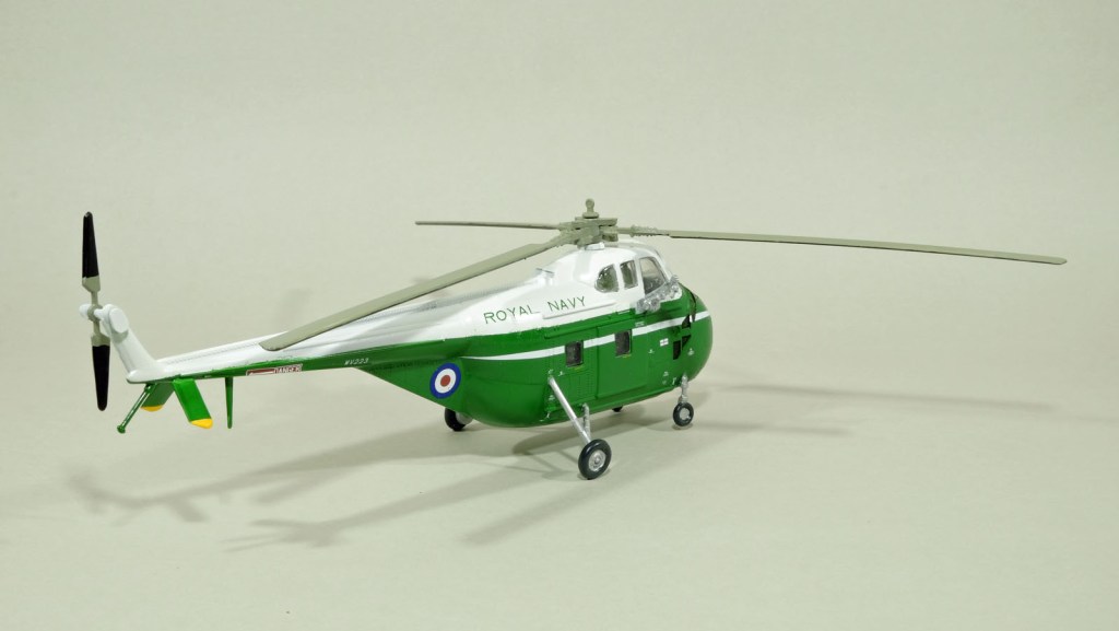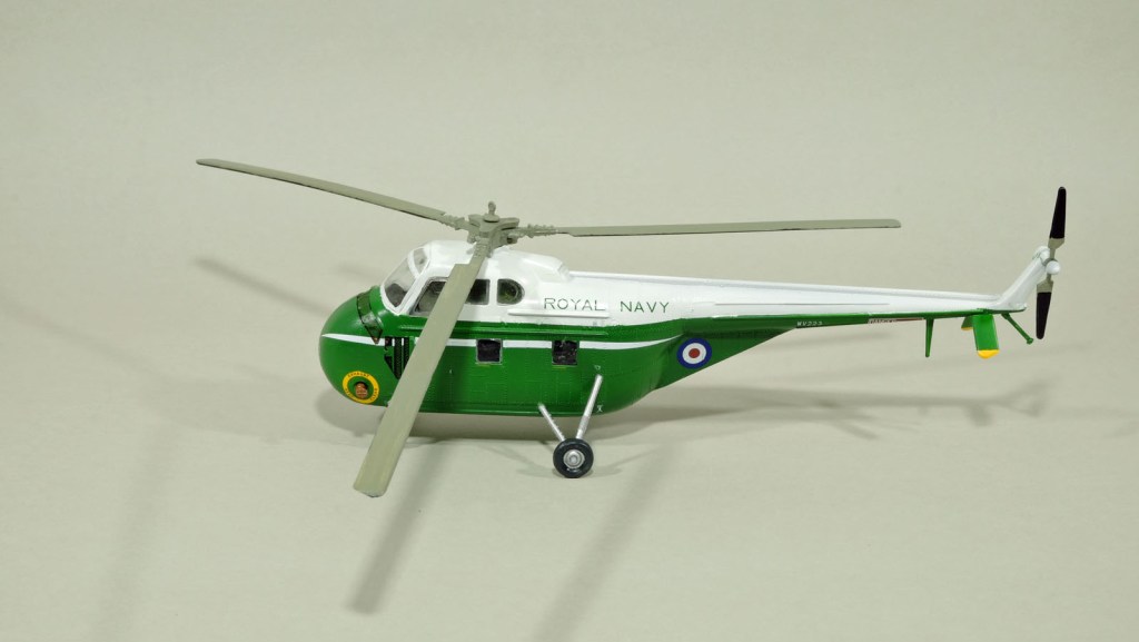 Part of my research material about this green -and-white helicopter suggests that it wore these colour so that it could function as an ornate flying Admiral’s barge for part of the Royal Navy. Other sources assign it a training role at a Naval Air Station.