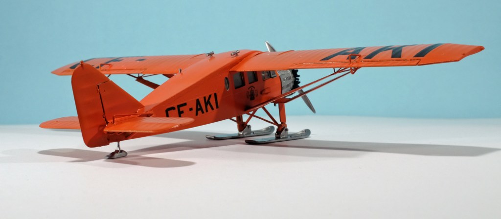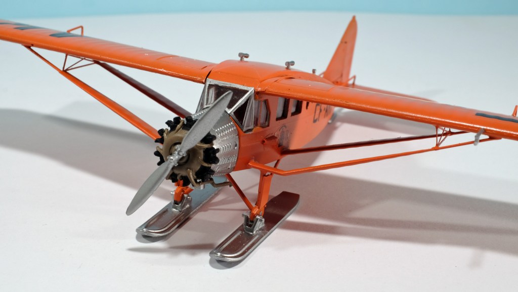 You cannot beat long, slow colour painting if the atmosphere is right. It took a full day to lay down the orange and wait – in the end I am very pleased. The application of the home-print decals over the gloss orange was a text book exercise and they have gone down under Tamiya semi-gloss to become perfect and invisible. The final stage was settling the plane on the skis using 5 minute epoxy as a cushion.