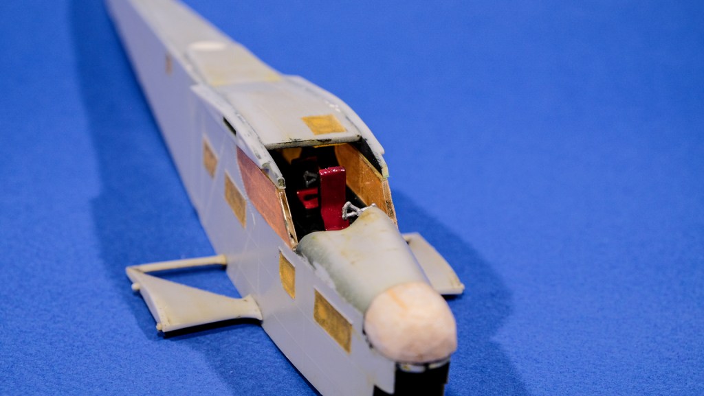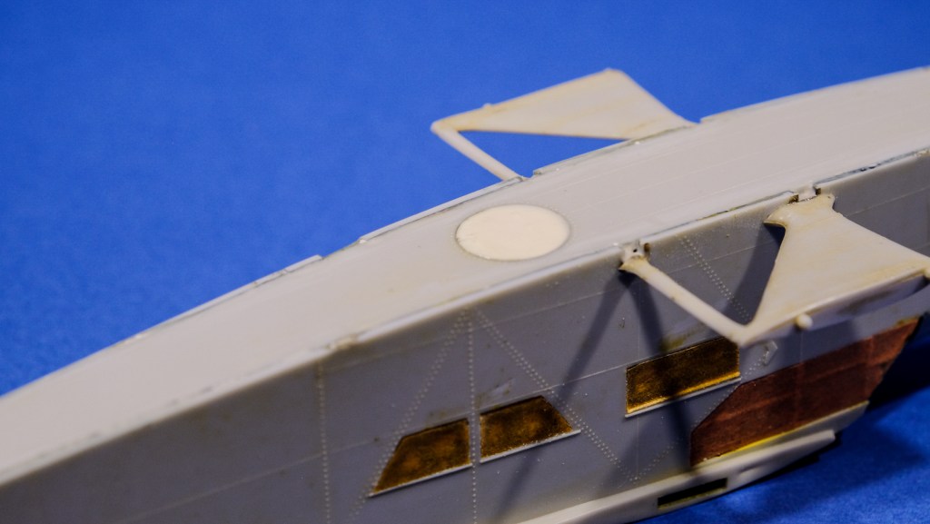 The 540T lost its guns – and I have plated over the dorsal and ventral turret positions. The nose turret was left out altogether and yes – that is a block of balsa wood super-glued to the nose. I shall sand and shape it to take a heavy sealer. It lives under a black topcoat anyway.