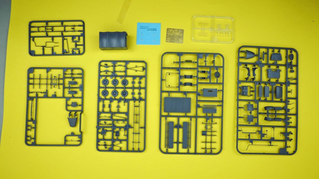 There are a surprising number of sprue trees and spare parts on them – I count alternate bonnets, frames, axles and springs, and cargo box. In my case I’ll build the box art version without the Wehrmacht extra fuel can but in civilian livery. The spare parts will always come in handy elsewhere.