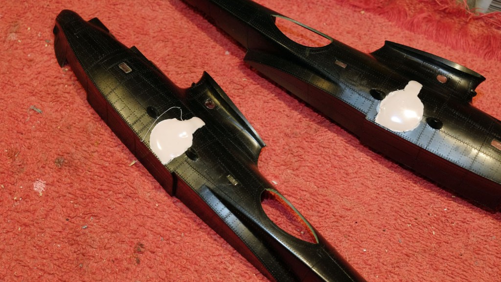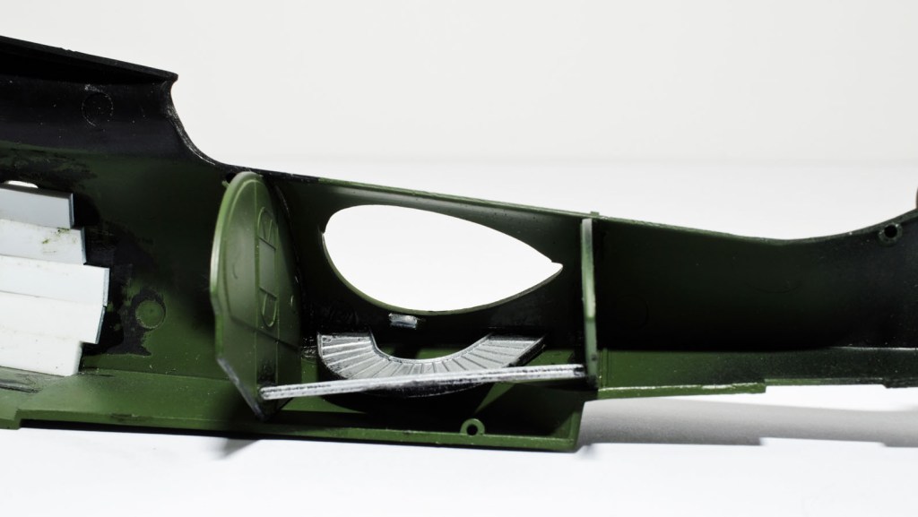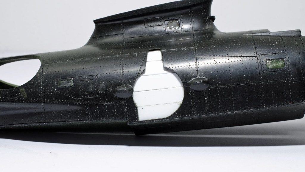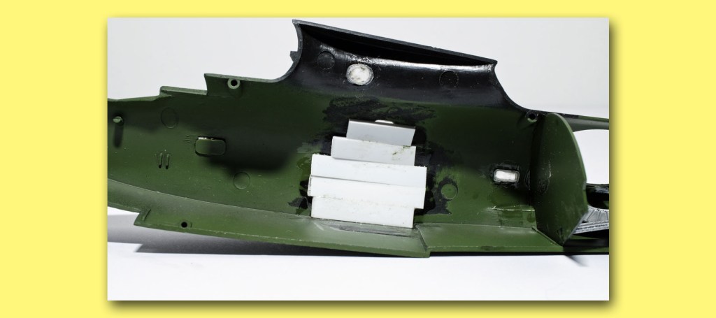 The filling work started with strips of Evergreen plastic cemented into the opening, then more strip added to the hollow trays this created. Final addition was home-made sprue goo to slightly over-fill the void. Then we’ll need some smoothing down and re-riveting.