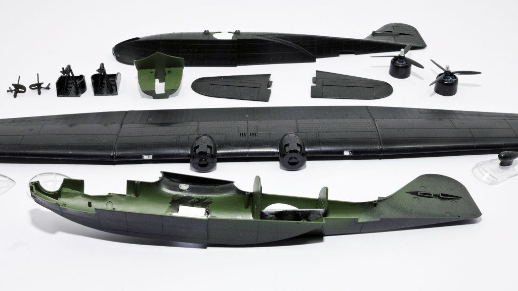 In the case of this Academy model of a PBY-5 – the well-known Black Cat version – the amount of cutting and glueing has been light, but several points of choice on the model have made, and the final result will depend upon them. As received, the landing gear wells were installed and the floats tucked up into the wing. The radome was attached to the cockpit canopy roof. There were .50’s cemented into the sponsons. All choices I should not have made, had I opened a fresh box.