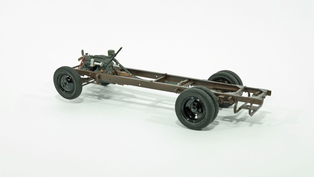 In this case the ZIS-5 truck ( made by the Ural factory, I surmise ) is not in military service so the underside can be as clean as normal roads might permit.