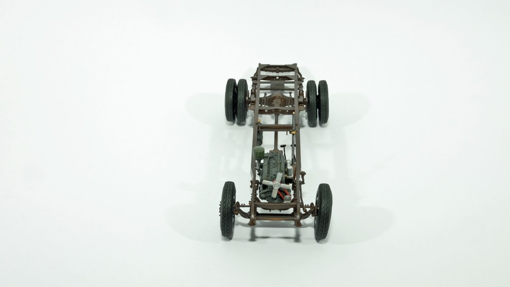 The most wonderful part of this Hobby Boss kit is what do don’t see: light under the tyres. All six of the rubber delights hit the ground at the same time. This is not the case with many lesser offerings in smaller scales – perhaps it is the size and weight that permit the thing to flex. In the case of this chassis, the toe-in and camber of the front wheels is fine – I do not have to hide the end result as I did with the old 1/24 Chrysler.