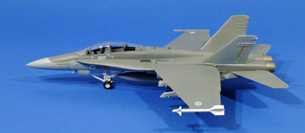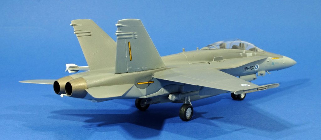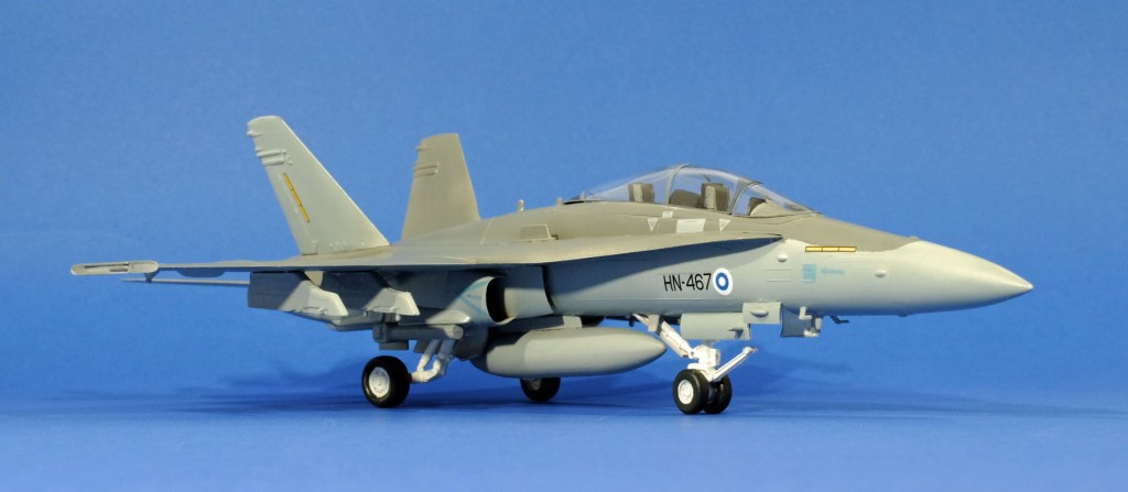 The load-out for this two-seater is derived from a photo taken recently to show that the Finnish air force can put a large number of planes into the air simultaneously. One large centre-line tank and one Sidewinder on the port wing.