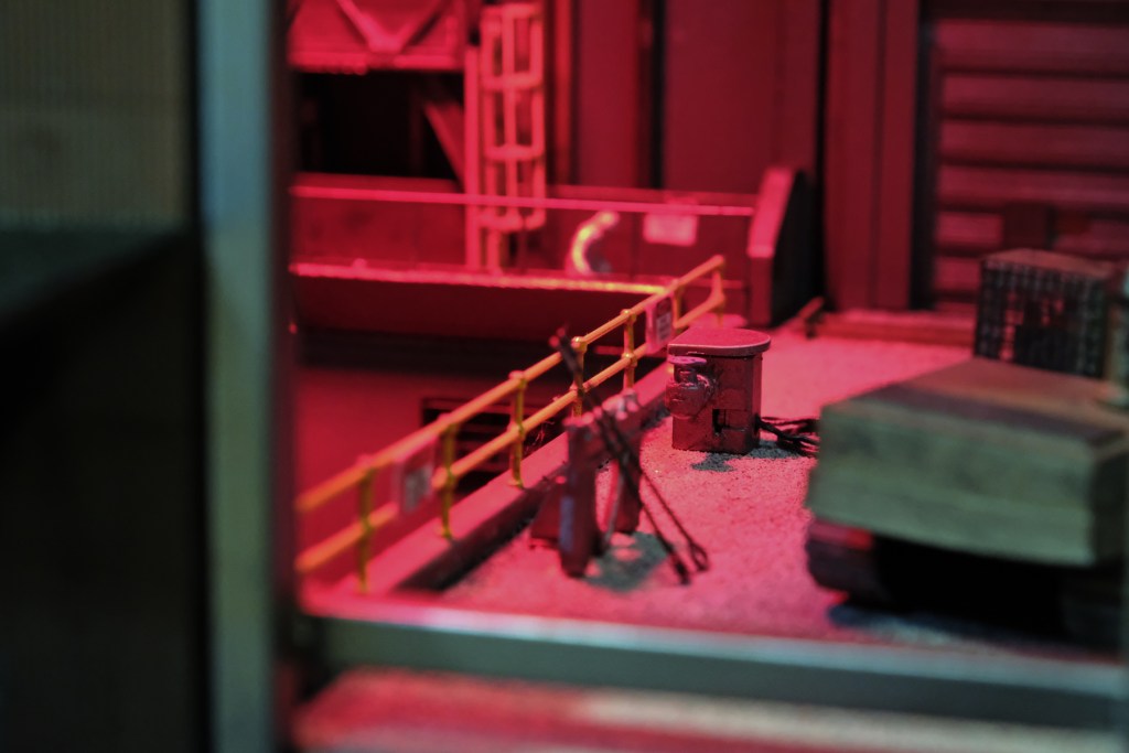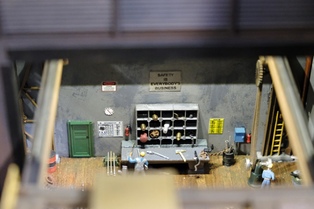 The red and blue lighting was particularly striking in the gloom of the mill. LED’s are ideal for this sort of thing – John France is getting great results with strip lighting inside a model aircraft carrier. Power requirements are low and modern battery packs can operate a display for an entire exhibition.