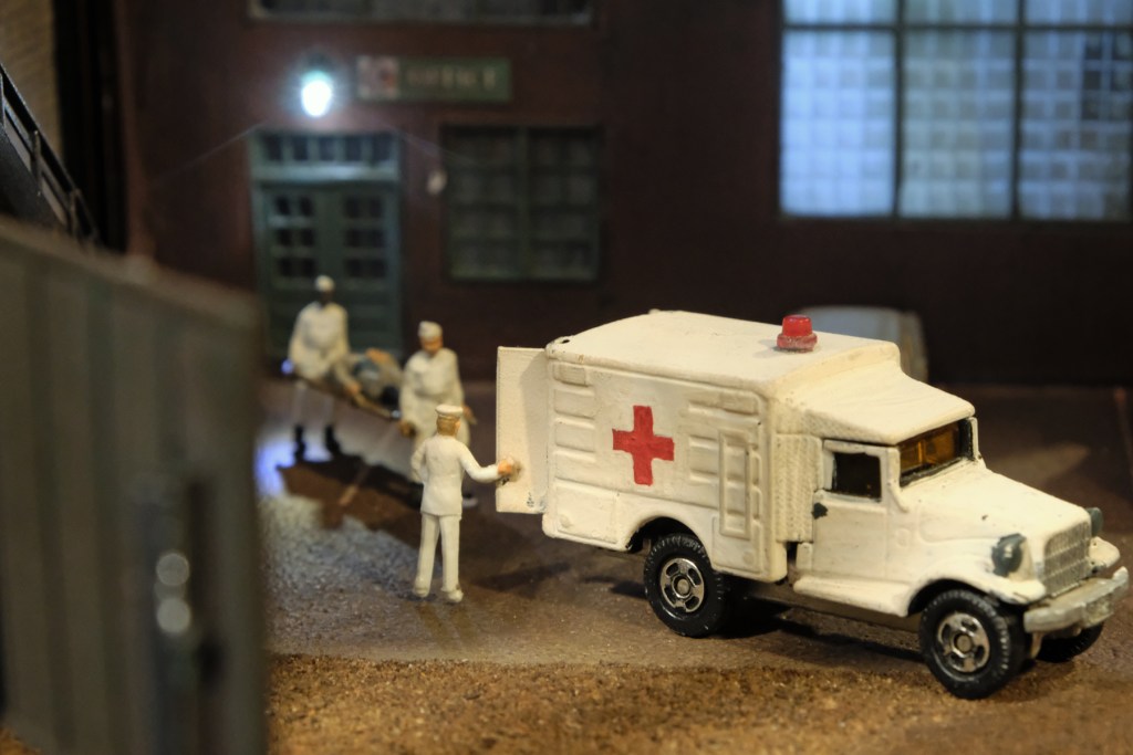 It may have been intended as part of a model railway layout, but could equally be a stand-alone display. It was good to look at from all four sides. Built to HO scale – 1:87 – it may have had other scale elements in it. Indeed I wonder if a few of the implements and machines were derived from sources other than hobby shops.