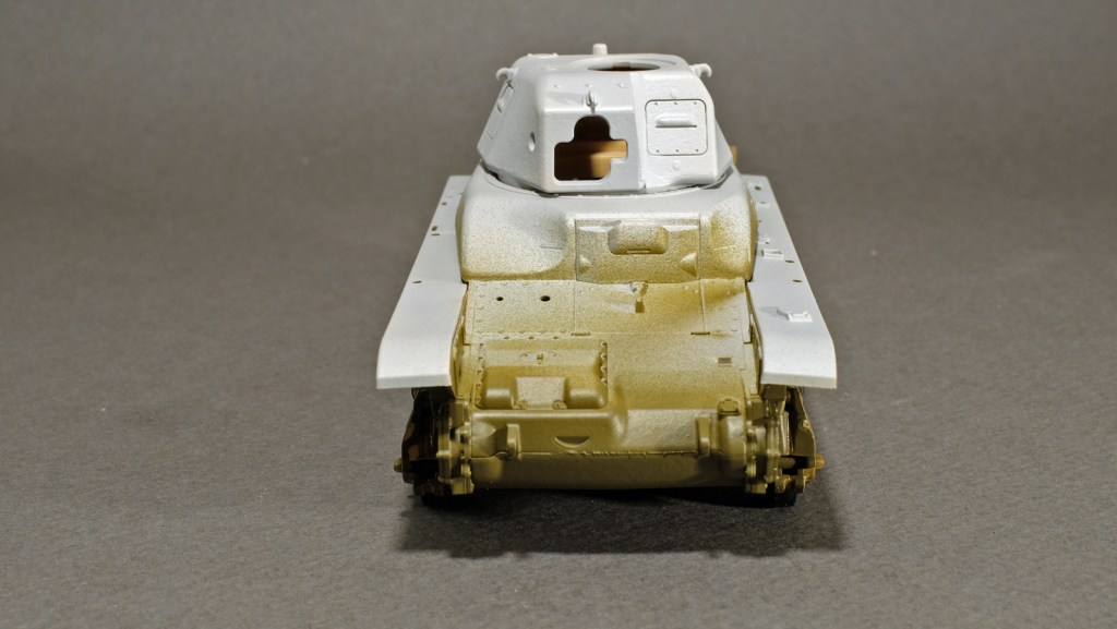 This Renault R-35 seems to make use of the squeeze-a-rubber bladder principle though there may be springs in there somewhere. The parts slotted in precisely once the spray paint was scoured out of the holes – sign of a precise fit.