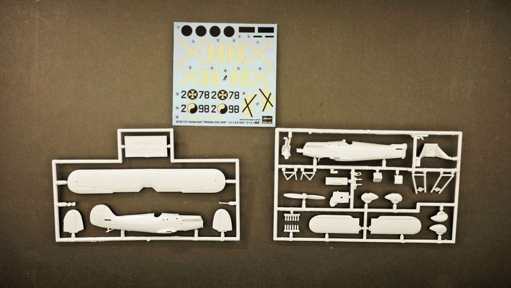 The kit is from Hasegawa – probably their classical period. Two sprue grey trees and a tiny clear windscreen in a bag. The decals are two planes from the Condor legion – one of which seems to have been flown by Adolf Galland. They are well printed, but superfluous; the civil markings are red/white/black tail bands and black registration numbers – all do-able on the inkjet printer.