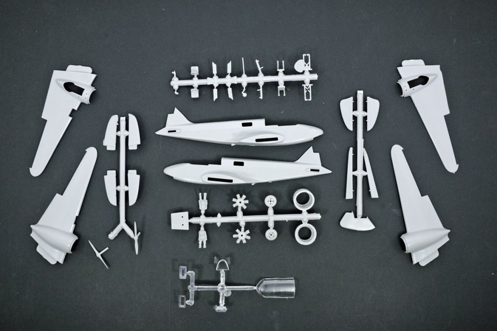 The parts have all the FROG failings – sink marks, flash, and ejector-pin marks, but they are fixable and all the bits are in the tatty old box.