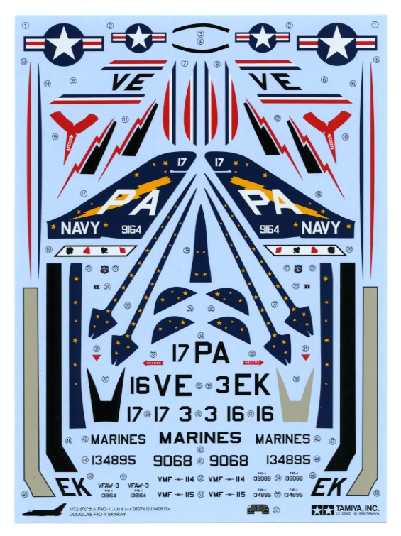The instructions are perfect, and I noted early on that there were three decorating schemes provided on the decal sheet – one garish US Navy interceptor squadron and two slightly more sedate US Marine Corps versions. I will choose on of these – I can see from internet images that the graphic tail is real, but I find it distracting from the smooth lines of the aircraft.