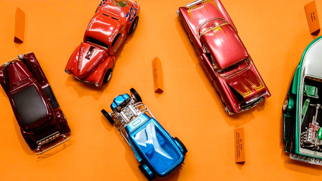 As I understand it, the models shown in this section of the hall were AMT brand. The company had made models of vehicles that won show trophies in the US hot rod scene , and the modeller completed them in like fashion. This display had history, craftsmanship, and colour all in one place. The use of the three sections of orange was brilliant. Each car was as a jewel in a setting.