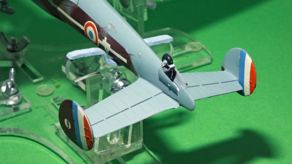 The idea of masking off the canopy and nose area with the clear plastic parts that would eventually be cemented there is common in scale model aircraft building – I see other club mates carefully laying masking tape into the panels of their larger-scale builds. It would be futile for me, as the frames of some 1:72 models are so ill-defined as to be imaginary.