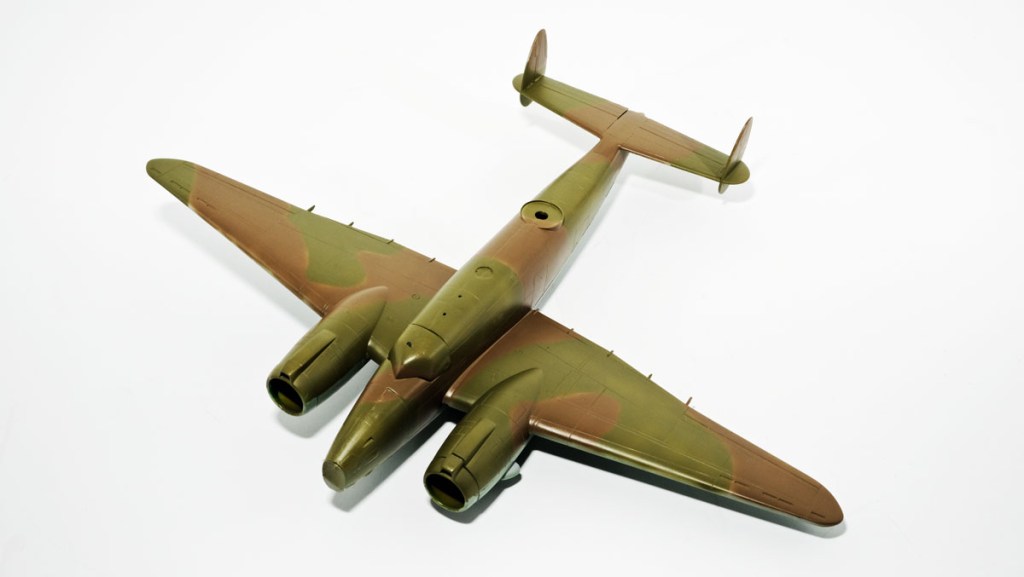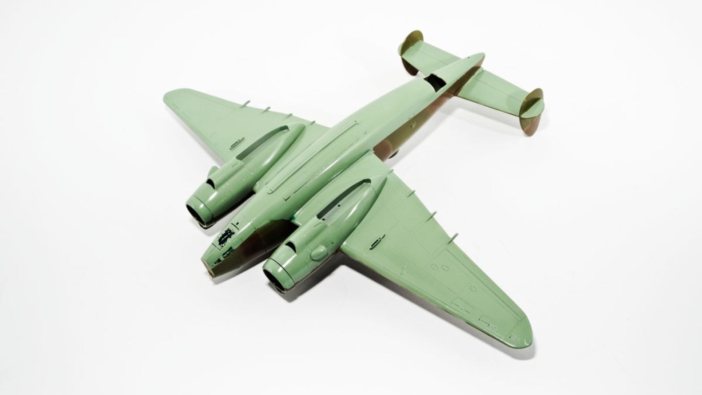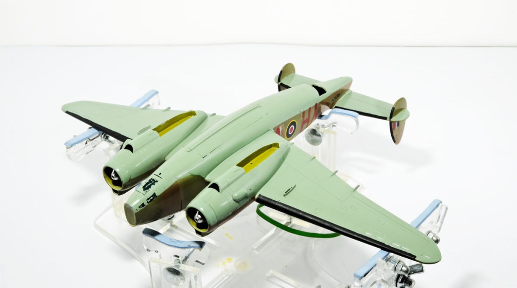 The ugly bug in the heading image had just received the third colour of a standard RAF day bomber scheme and was waiting to be de-husked. The masking was, if anything, worse looking than usual, but for a good reason. The worms were standard but the rubber mask between the lines was a cheap product from the art supply store slopped on with cotton swabs. Simple and completely effective…at a low cost.