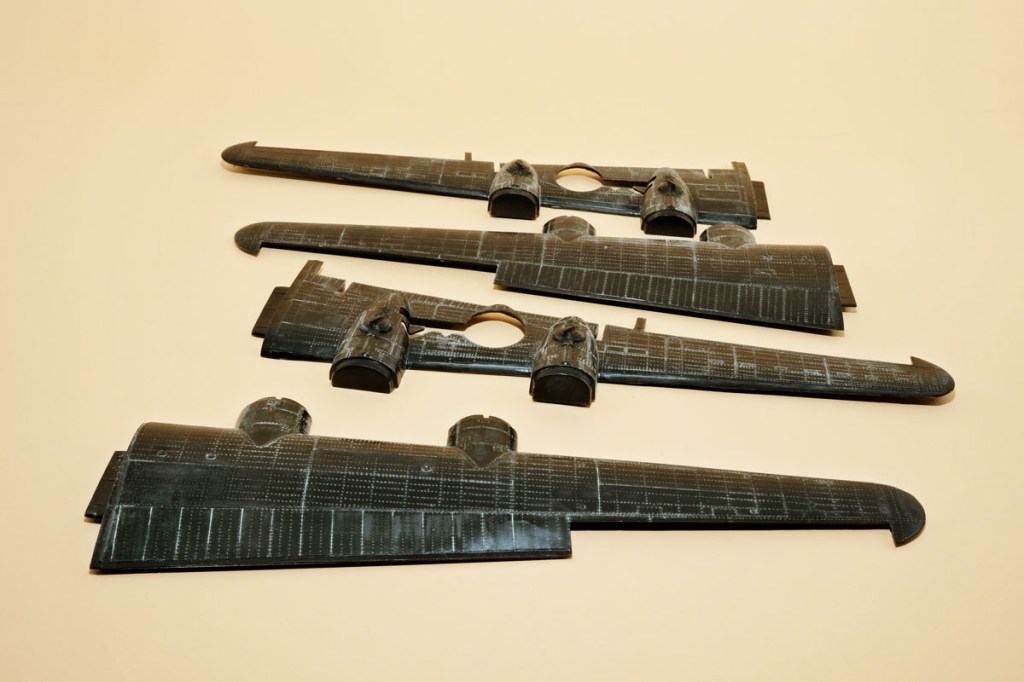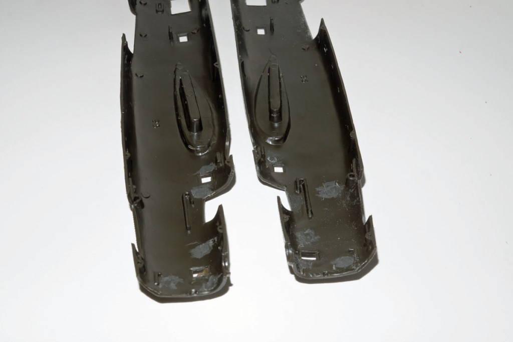 I researched other’s efforts and found one ambitious chap who sanded the rivets off entirely. His build looked good, but almost too smooth. I determined to try for a compromise – I took to the major parts with a sheet of 1000-grade wet-and-dry paper. Not to remove them entirely – just to knock down their prominence. I know that Mr. Surfacer 1000 would mask them as well.