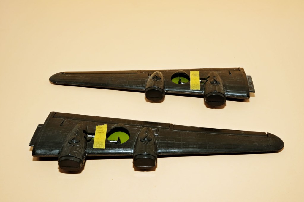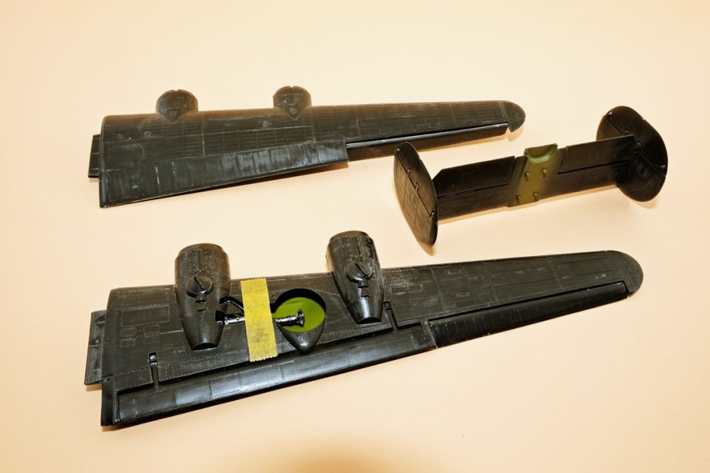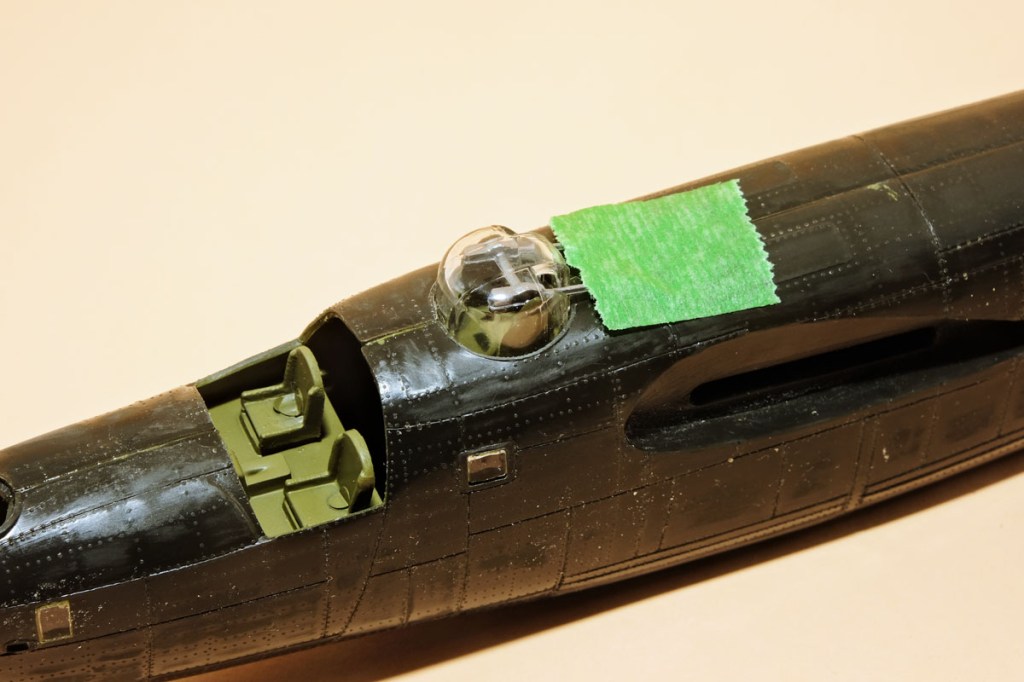 But the bane of the adult builder – working play features were ready to trap the unwary – you needed to include the top turret and the main landing gear struts in their respective places before closing up. This exposes th top turret to sanding mistakes and gun barrel breakage. I guarded against this by taping the wretched things flat while working and then coating the clear parts with masking fluid. Not the best, but the only option.