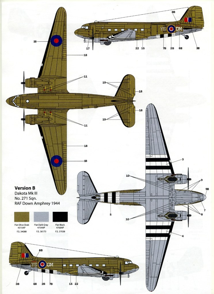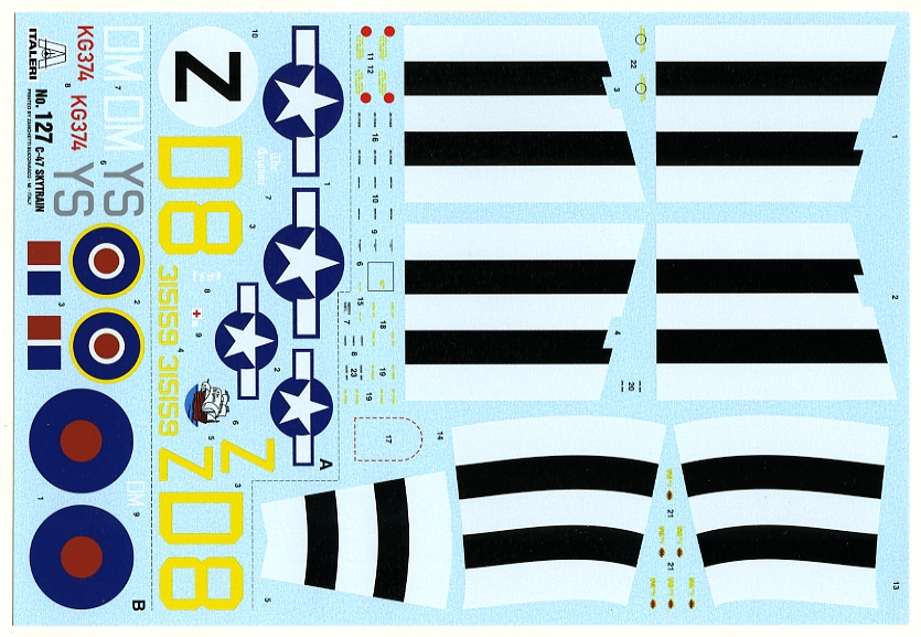 The kit as a Dakota has all the D-Day stripes, stars, and roundels that you would need for that version. I keep these sheets for when I need a pure white or black panel as Italeri decals go on so well.