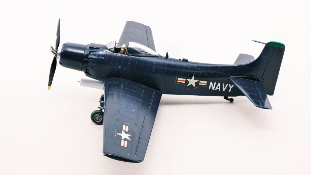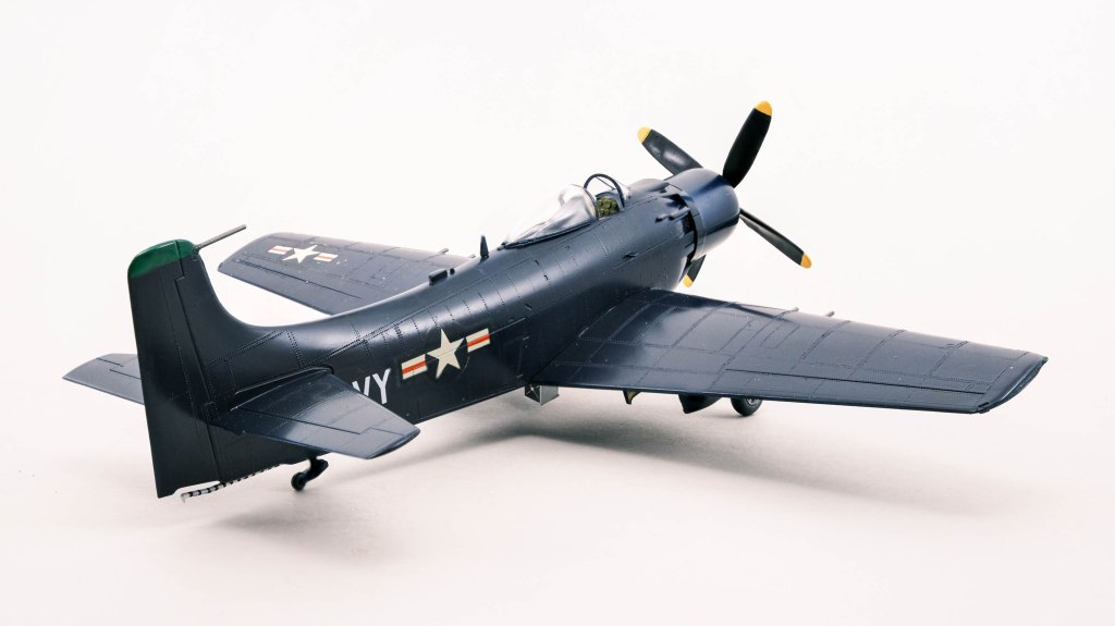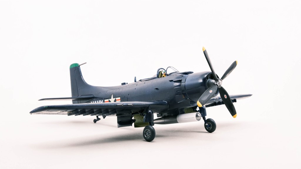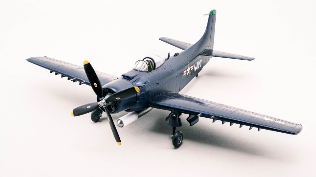 This Fujimi kit was perfect for an attempt to make a 1951 Skyraider. There are no unit numbers, as none of my spare decals match the 500-series of the raiders. But the Mk.13 underneath is pretty good and I have a Corsair to display with it.
