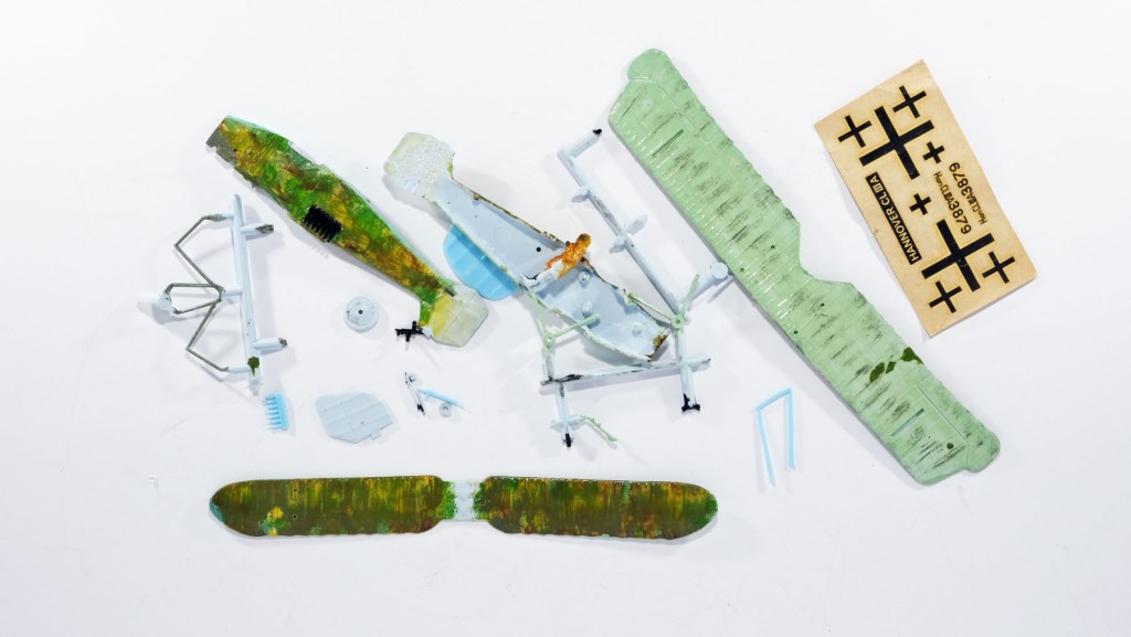 Paint removal first – with alcohol and Q-tip scrubbing for the fuselage and a soak in Easy Lift Off for the main struts and the crew. Some parts were damaged beyond repair – the tiny bombs stacked near the gunner had their tails broken off. They could be removed as excess anyway.