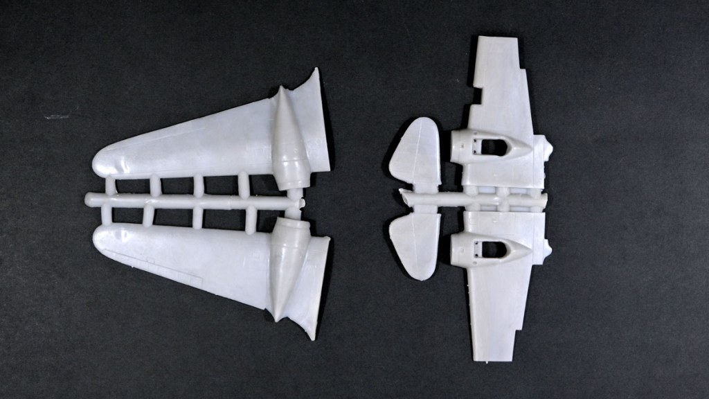 The three sprue trees are in hard plastic with flash, sink marks, and fumbled detail all over. The main parts are commendably thick, and will need to be to stand the filling and sanding that is to come. There are two apology parts…