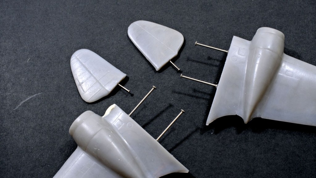 The wings and horizontal stabilisers are going to need help to cling to the sides of the fuselage so it is out with the packet of pins and the drill. This is actually a lot of fun to do and if you prepare the empennage beforehand, the holes in the fuselage are simple to to locate. If you need wiggle room, just file out the holes a bit.