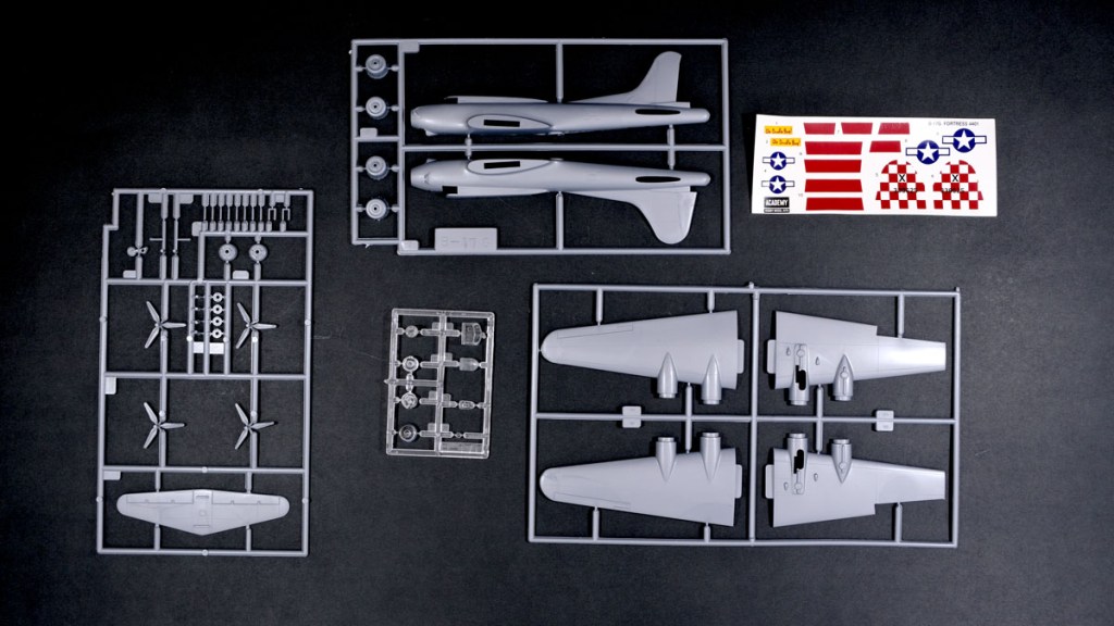 True to form, I intend to depict it flying with retracted wheels and spinning props. There are no end of schemes for a B-17 depicted on the net but as the decals for this kit seem to still be in good shape, there is no reason not to build to the box art. And why not try a few different panels in shining or matt aluminium – and a few exhaust stains.